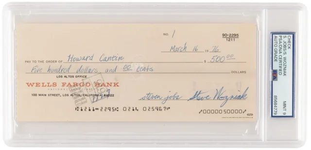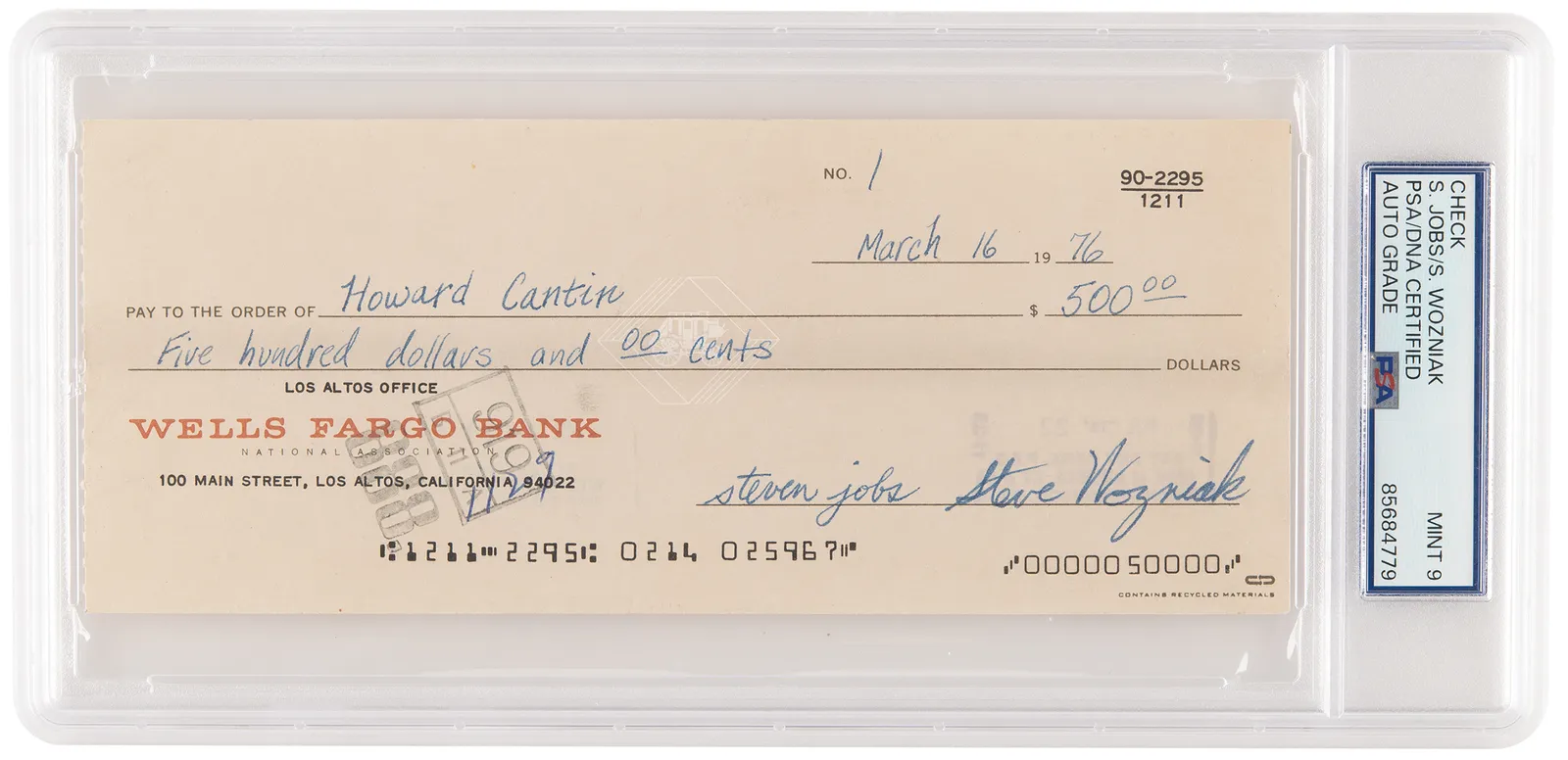 Gli articoli relativi agli inizi della storia di Apple, in particolare gli articoli che coinvolgono Jobs, hanno raggiunto prezzi stratosferici negli ultimi anni. Jobs period notoriamente riluttante a firmare oggetti e la sua firma è considerata tra le più preziose tra quelle di qualsiasi personaggio pubblico. Anche un biglietto da visita firmato può valere tanto sei cifre. “C’è un legame emotivo tra Steve Jobs e i collezionisti”, afferma il vicepresidente esecutivo di RR, Bobby Livingston. “Le persone che avviano una propria società Web o di ingegneria adorano i prodotti Apple.” Lonnie Mimms, proprietario dell’assegno n. 2 e fondatore di un museo della tecnologia a Roswell, in Georgia, parla del valore di tali pezzi di carta. “Puoi ottenere qualsiasi cosa al mondo con la firma di Steve Wozniak sopra, ma Jobs è un’altra storia. E loro due insieme sono la più alta forma di rarità.”