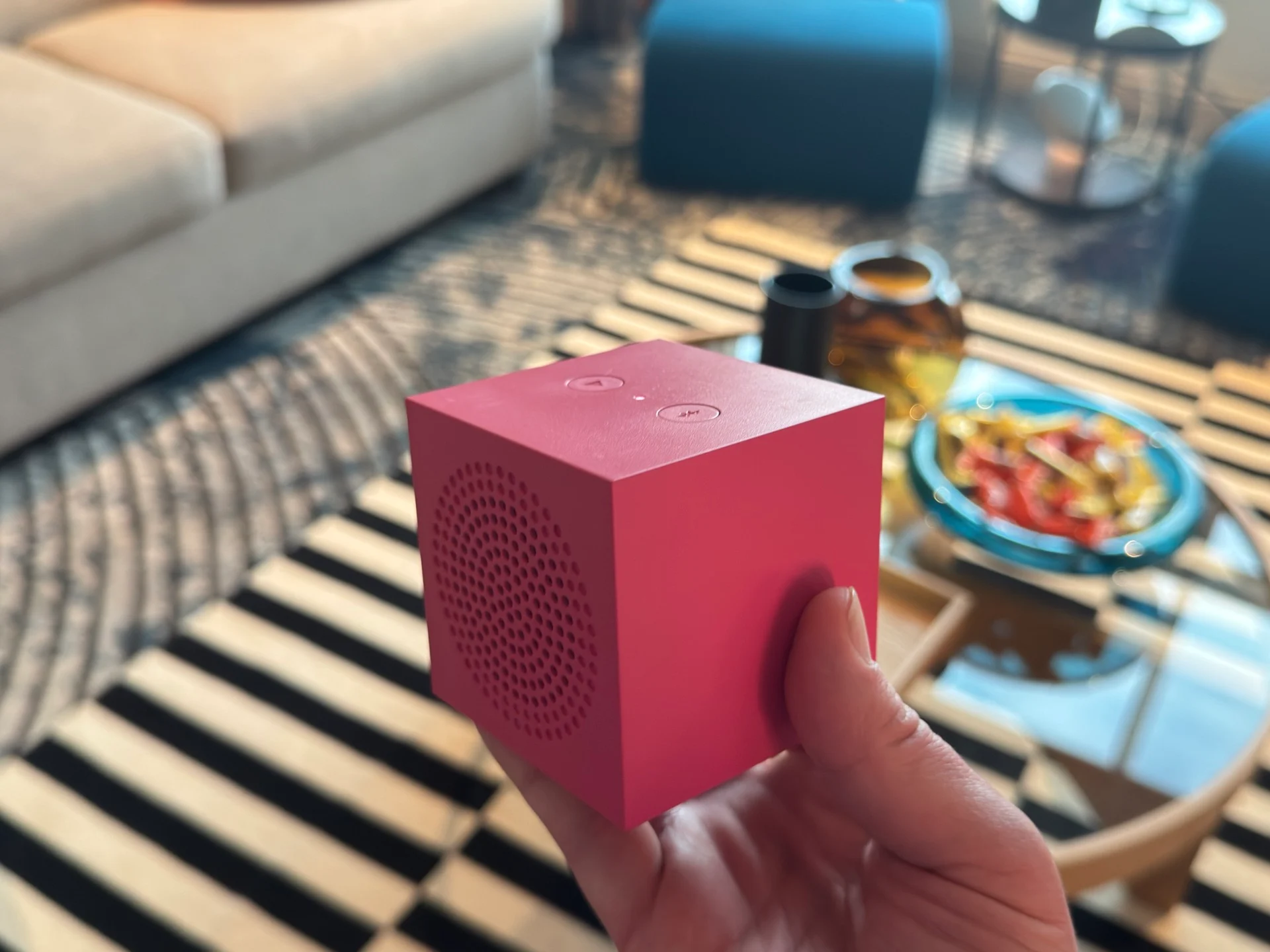 Il Kallsup è leggero ma solido, una scatola di plastica con fori per gli altoparlanti su un lato, una porta USB-C sul retro per la ricarica e due pulsanti a cavallo di una piccola spia di stato LED per alimentazione, riproduzione e accoppiamento. È stato subito affascinante, e non solo perché è così dannatamente adorabile; ogni azione che fai su di esso provoca questi stravaganti rumori prodotti dall’uomo, come un boop o un sibilo. Gli altoparlanti utilizzano Bluetooth 5.3 e fino a 100 altoparlanti Kallsup possono essere sincronizzati insieme eseguendo la corretta sequenza di pressioni prolungate del pulsante di riproduzione tra di loro.