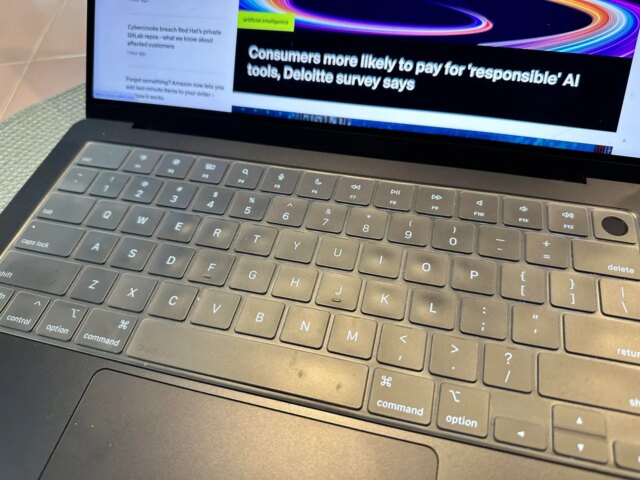 GhostCover è una cowl per tastiera sottile e trasparente che si posiziona proprio sopra i tasti del mio MacBook Professional M3. È setoso al tatto, ma è così elegante che non mi accorgo nemmeno che sia lì. È traslucido, quindi non ostacola la visione dei tasti e ha un ritaglio dedicato per Contact ID. Anche il mio laptop computer si chiude ancora a filo, quindi non preoccuparti dell’ingombro aggiuntivo.