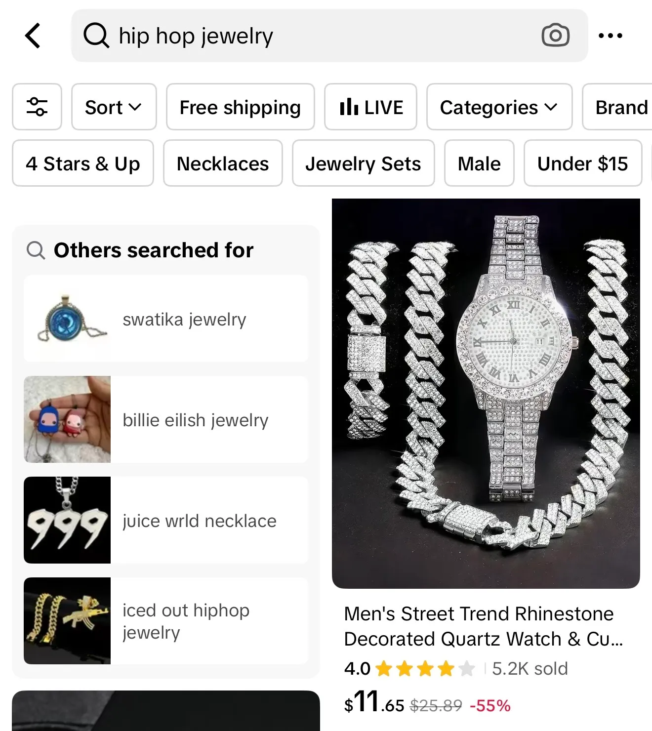 Il mio viaggio continua TikTok Store ha iniziato con la ricerca di “gioielli hip hop”. È una question di ricerca innocua che probabilmente hanno digitato più utenti, sperando di trovare qualcosa da indossare. Mentre sfogliavo i gioielli economici, sono rimasto colpito da ciò che l’algoritmo di TikTok ha ripetutamente suggerito che potrei essere interessato anche a me: gioielli con palese simbolismo nazista.