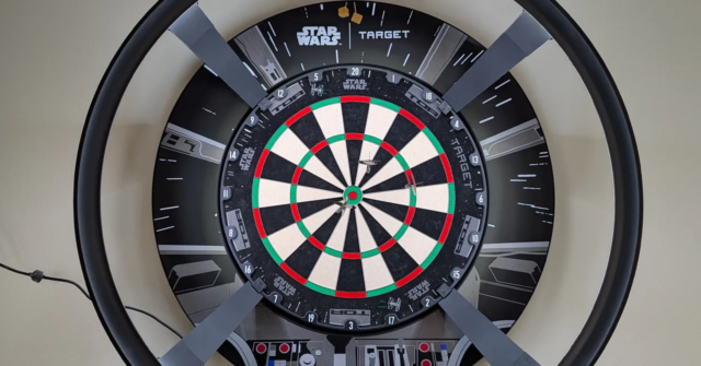 Il sistema di punteggio automatico Goal Darts Omni si accoppia con l’app DartCounter (Androide O iOS). È facile e veloce da assemblare, si fissa alla scheda tramite gambe magnetiche, ma dovrai collegare il cavo di alimentazione a una presa. Connettiti al Wi-Fi, esegui una breve calibrazione ed è ora di giocare. Ho provato con Goal Surround e bersaglio per freccette del Millennium Falcon di Star Wars ($200 O £ 150) e una serie di Freccette Darth Vader ($ 340 O £ 250)—entrambi fantastici regali di Star Wars per il fan della tua vita—ma dovrebbe funzionare con la maggior parte dei tabelloni e di tutte le freccette.