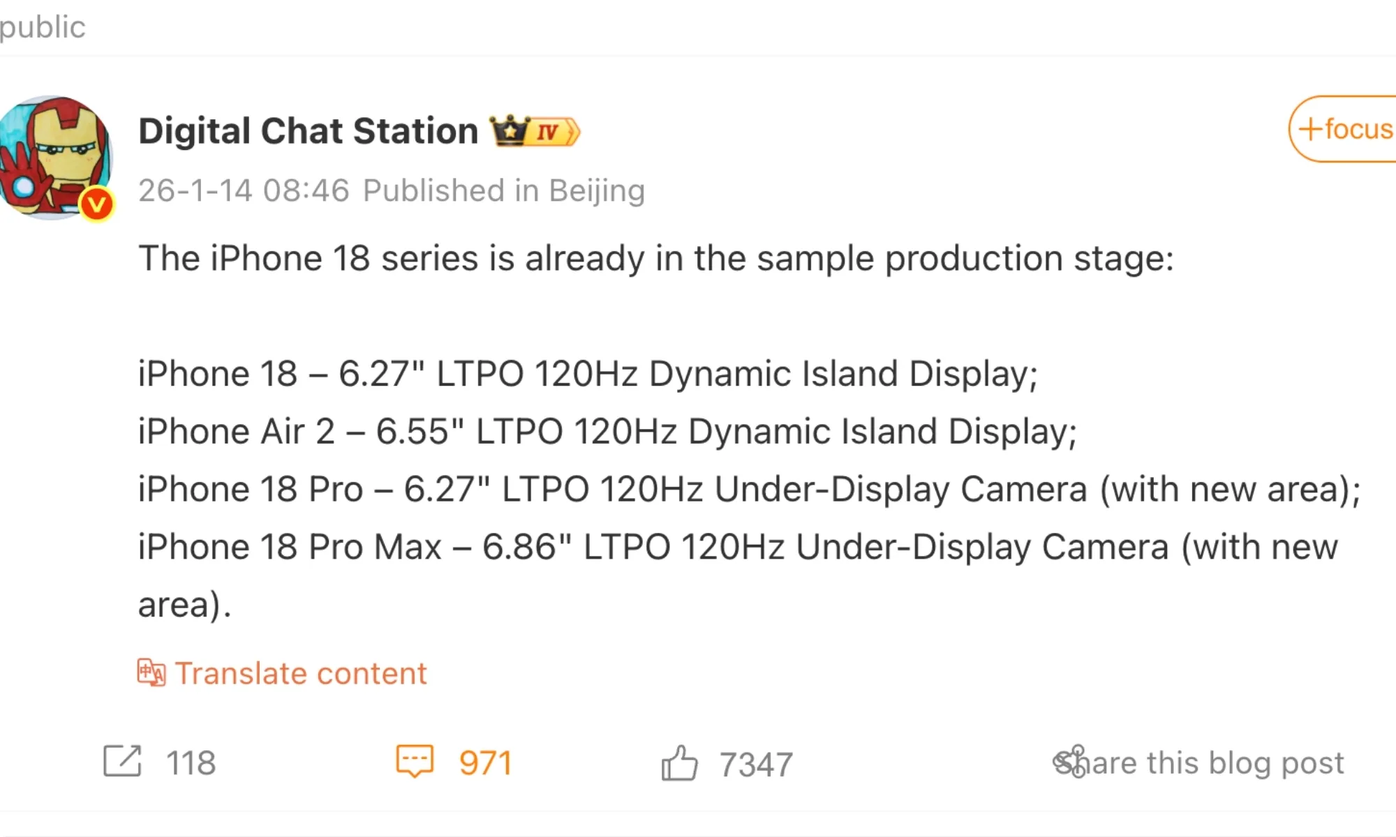 Sono passati circa quattro mesi dal lancio dell’iPhone 17 e le voci sulla serie iPhone 18 hanno già iniziato a circolare. La più recente arriva dal informatore cinese Digital Chat Station (by way of Weibo), e fa luce sulle specifiche del show dell’intera gamma.
