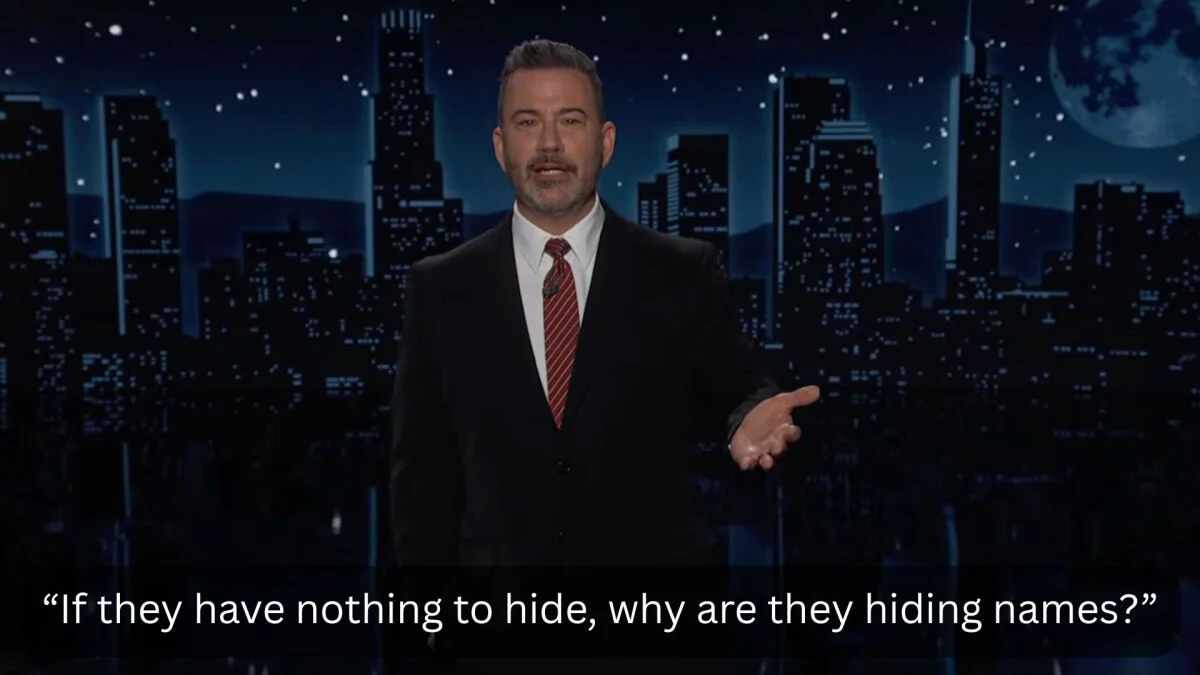 “Esatto. È così trasparente che hai dovuto oscurare il suo nome un migliaio di volte”, cube Kimmel.