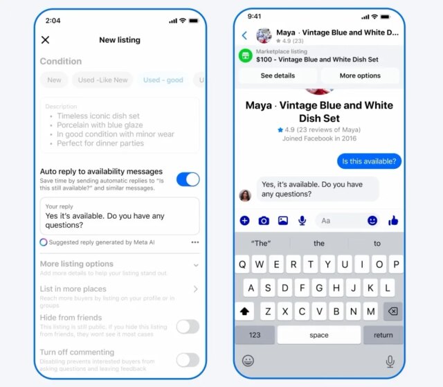 Meta crede di avere una soluzione al caos. L’azienda sta introducendo strumenti basati sull’intelligenza artificiale sul Market che gestiscono automaticamente i testi degli acquirenti. I venditori ora possono abilitare le risposte automatiche che estraggono informazioni direttamente dalle loro inserzioni, inclusi prezzo, descrizione e luogo di ritiro, per rispondere istantaneamente alle domande più comuni.