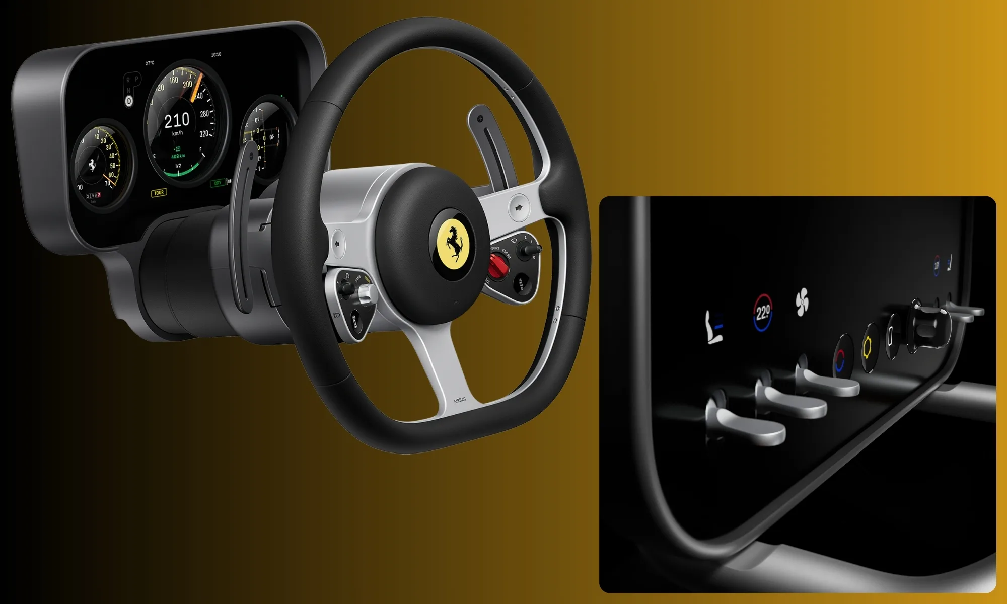 Il volante si ispira al volante Nardi in legno a tre razze degli anni ’60 e il suo materiale in alluminio riciclato è stato sviluppato appositamente per Luce. La posizione dei pulsanti è ispirata alle auto di Components 1, mentre il tasto di avvio presenta un show e-ink che si illumina insieme alla console centrale e alla chiesuola.