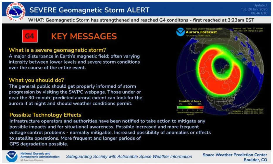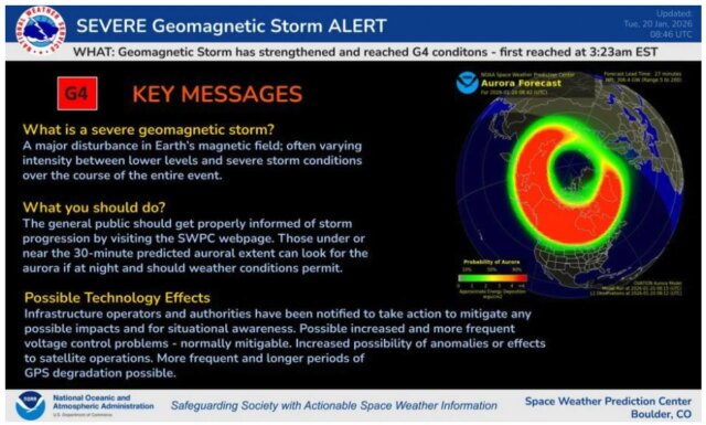 Lo Area Climate Prediction Heart (SWPC) della Nationwide Oceanic and Atmospheric Administration sta monitorando attivamente la grave tempesta di radiazioni solari. Le particelle cariche, rilasciate dal Sole, hanno raggiunto la Terra lunedì, provocando una tempesta solare classificata 4 su 5 su una scala di gravità.