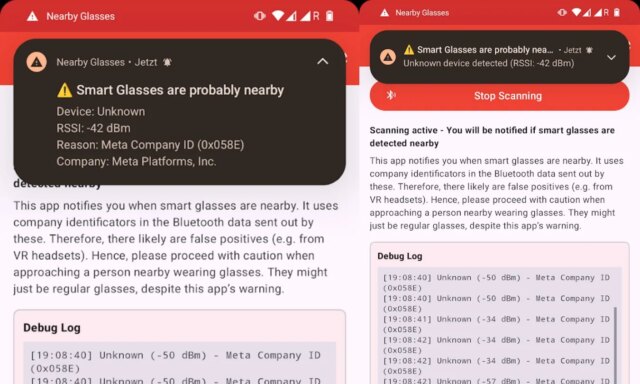 Una nuova app Android può avvisarti se qualcuno che indossa occhiali come i Meta Ray-Ban è nelle vicinanze. 404 mezzi individuato per la prima volta lo strumento, chiamato Occhiali nelle vicinanze. Funziona raccogliendo i segnali Bluetooth che questi dispositivi inviano costantemente, quindi inviando una notifica quando ne trova uno.