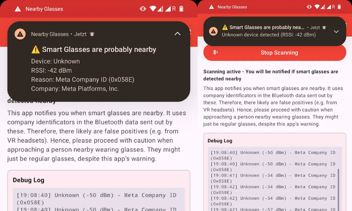 L’app non è impeccabile e Jeanrenaud è onesto al riguardo. La sua pagina Play Retailer avverte di probabili falsi allarmi, in particolare provenienti da visori VR. In un check, ha individuato un Meta Quest 2 e ha inviato un avviso sugli occhiali intelligenti, con il registro di debug che nominava correttamente il dispositivo.