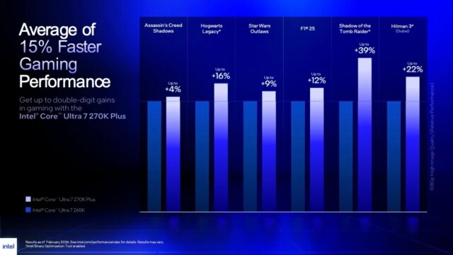 Sebbene la precedente CPU Core Extremely 9 285K di Intel sia stata costruita più per prestazioni di produttività, questi nuovi chip sono progettati per il segmento dei giochi (facilmente il più rumoroso e più affamato di aggiornamenti dell’intero mercato desktop). In un gioco come L’ombra del Tomb RaiderIntel promette un aumento del body charge del 39% rispetto al 265K. Il chip potrebbe avere guadagni più modesti in titoli come Fuorilegge di Star Wars al 9% e Murderer’s Creed: Ombre con un aumento solo del 4%.