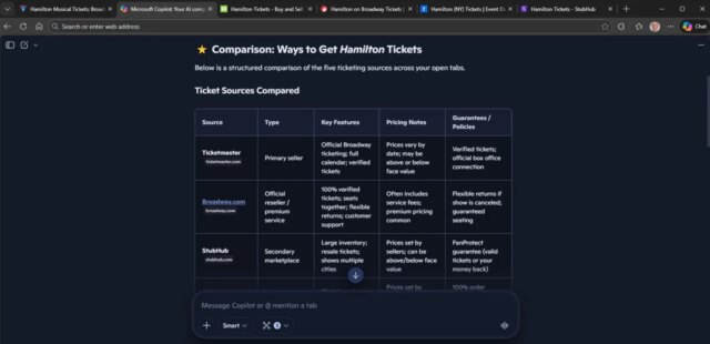 COME notato da PC Worlduna modalità Copilot relativamente nuova può analizzare tutte le schede aperte contemporaneamente. Apri due o più schede e chiedi a Edge di riepilogare le informazioni in tutte. In cambio, il browser visualizza un riepilogo che condensa i dettagli in un colpo solo.