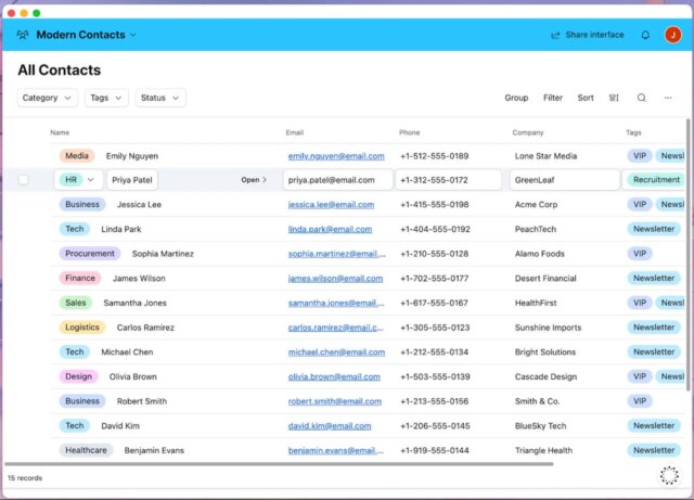 Una cosa che ho fatto con Airtable è stata utilizzare Omni AI integrata per creare un’app di contatto che soddisfacesse le mie exact esigenze. Tutto quello che dovevo fare period digitare una question, rispondere advert alcune semplici domande e l’app veniva creata. Sono rimasto scioccato nel vedere quanto bene l’intelligenza artificiale sia riuscita a creare l’app con tutte le funzionalità che avevo richiesto e un’interfaccia utente moderna. In effetti, dopo aver creato l’app con Airtable, sto pensando di renderla il mio gestore di contatti preferito. E poiché AirTable funziona su tutte le piattaforme che utilizzo, posso mettere da parte le altre app e restare con questa.