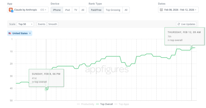 Le pubblicità di Anthropic al Tremendous Bowl – che presentano scenari cupamente comici di persone che cercano consigli dai chatbot, solo per essere indirizzate verso siti di incontri “cougar” e solette che aumentano l’altezza – hanno dato i loro frutti. Da allora, Claude, il chatbot AI di Anthropic, è salito dal numero 41 dell’App Retailer statunitense fino a diventare una delle 10 migliori app. A partire da venerdì, Claude si trova al numero 7, il suo posizionamento più alto fino advert oggi, suggerendo che il suo tono “nessuna pubblicità” ha una forte risonanza tra gli utenti.