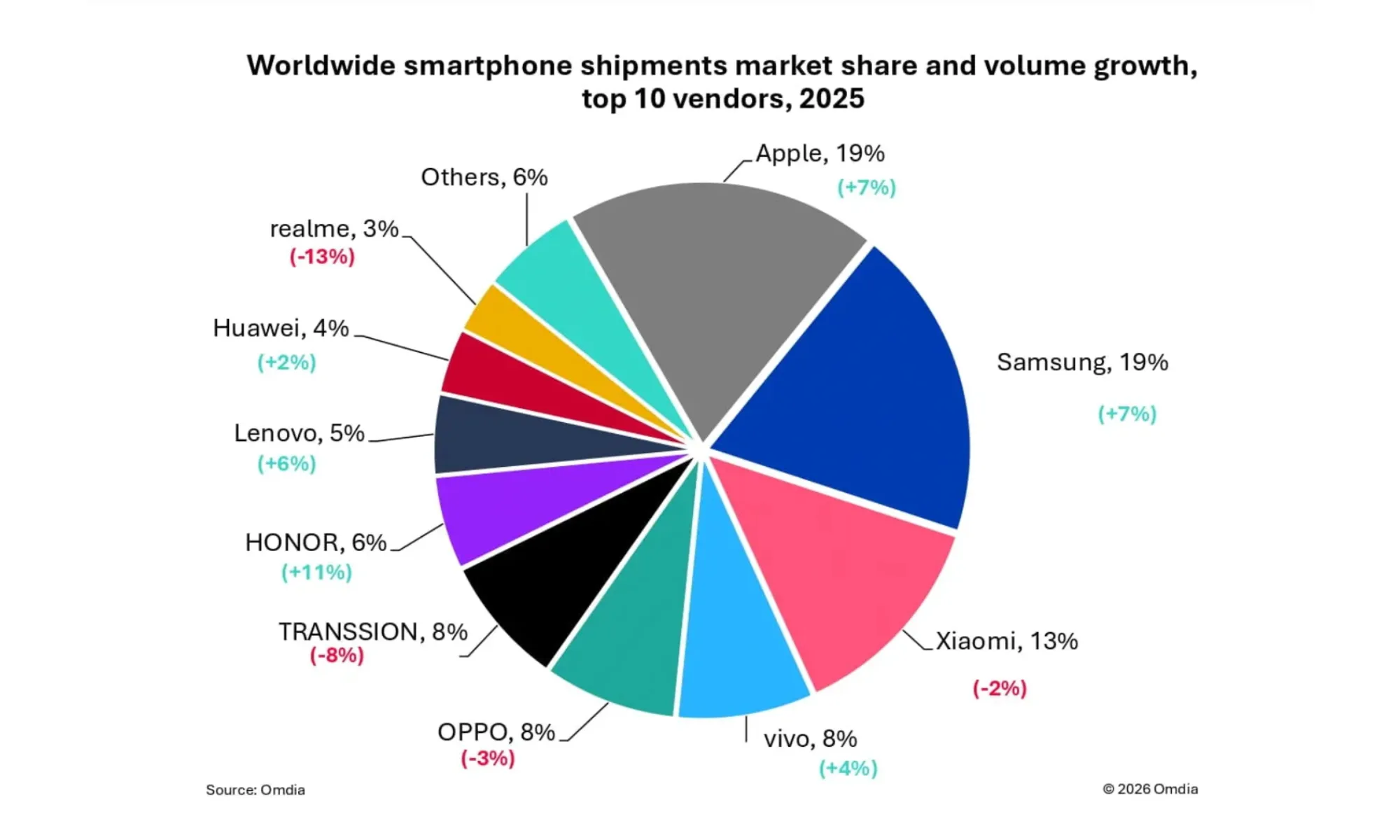 Il rapporto rileva che le spedizioni globali di smartphone sono cresciute complessivamente del 2%, con Apple in testa al mercato, che ha registrato una crescita del 7% su base annua e ha conquistato una quota di mercato del 19%. Samsung ha seguito da vicino con cifre di crescita e quote di mercato simili, mentre Xiaomi si è classificata terza con una quota di mercato del 13% nonostante un calo delle spedizioni del 2%.