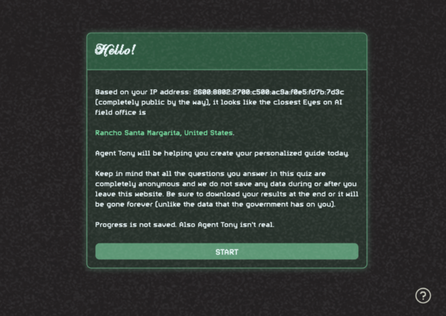Questo è intenzionale, ha spiegato Hana Memon, stratega digitale, organizzatrice e creatrice di Eyes on AI della Gen Z For Change. In linea con i propri principi, la risorsa non chiede all’utente di fornire alcuna informazione di identificazione personale che potrebbe essere raccolta e utilizzata da una parte esterna, come la razza o lo stato di immigrazione, ma può comunque capire molto su di te e sulla tua igiene digitale.