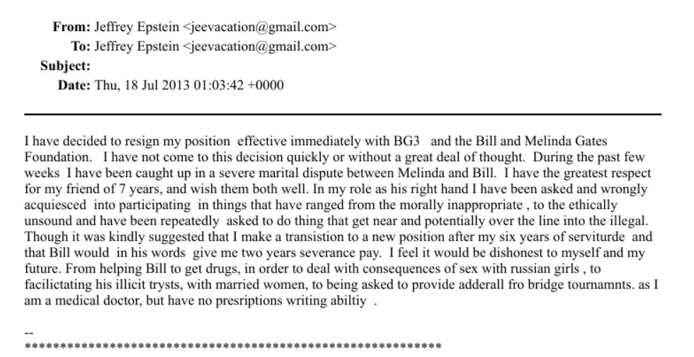 Le accuse fanno parte di un’e-mail che Epstein si è inviato il 18 luglio 2013.