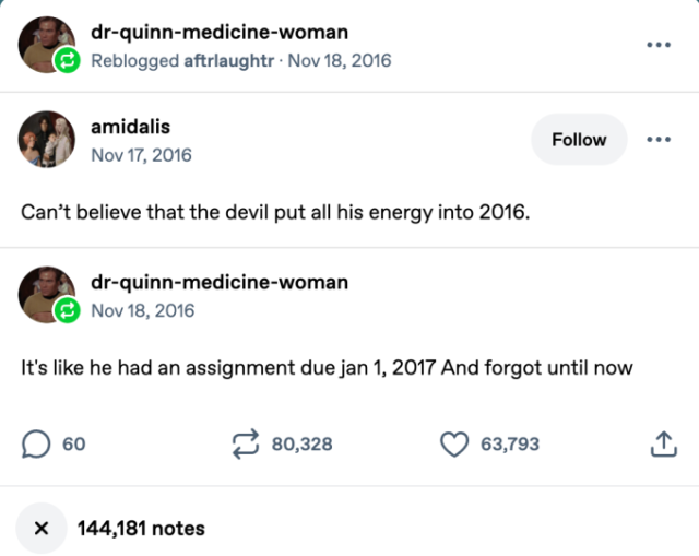 Ma come spesso accade, la nostalgia supera buona parte dell’ansia che già allora period palpabile. Quando la bibliotecaria di meme Amanda Brennan ha cercato nei suoi archivi le immagini che hanno definito il 2016, mi ha mostrato uno screenshot che mi ha sorpreso, information l’attuale ossessione di Web per quell’anno. Il put up recita: “Non posso credere che il diavolo abbia messo tutta la sua energia nel 2016”, con un altro utente che aggiunge: “È come se avesse un compito in scadenza il 1 gennaio 2017 e se lo fosse dimenticato fino advert ora”.