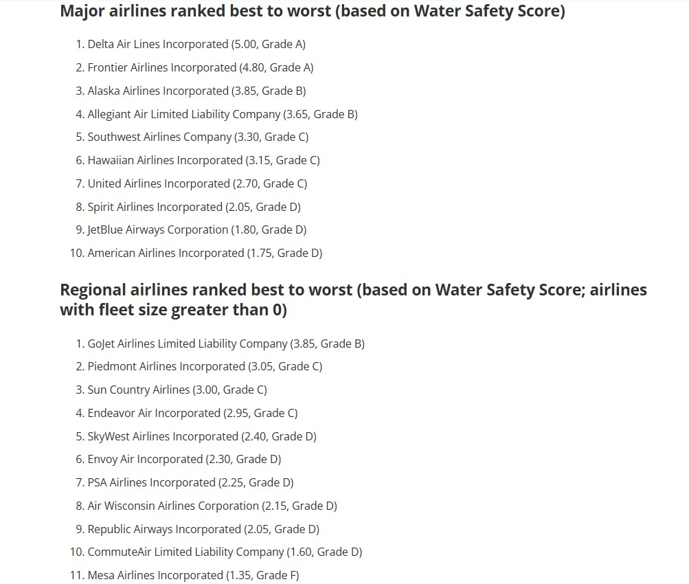 Lo studio Airline Water Research del Centro si concentra su 10 compagnie aeree principali e 11 regionali che operano negli Stati Uniti. I ricercatori hanno analizzato i dati EPA raccolti da queste compagnie aeree tra il 1 ottobre 2022 e il 30 settembre 2025. Hanno utilizzato diversi parametri per elaborare le loro classifiche, con punteggio da 0 a 5, presentate anche come voti in lettere. Questi criteri includevano il numero totale di violazioni per aeromobile, gli avvisi pubblici e la quantità di violazioni derivanti dall’avere troppo Escherichia coli nella loro acqua e con quale frequenza le compagnie aeree pulivano la loro acqua.
