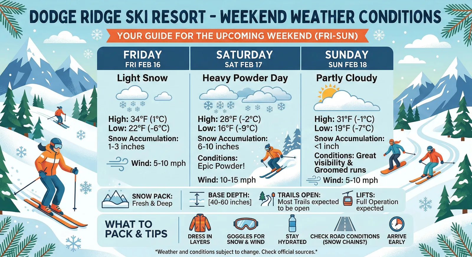 Questo nice settimana andrò a sciare a Dodge Ridge con alcuni amici. Potresti creare un’infografica che copra le condizioni meteorologiche?