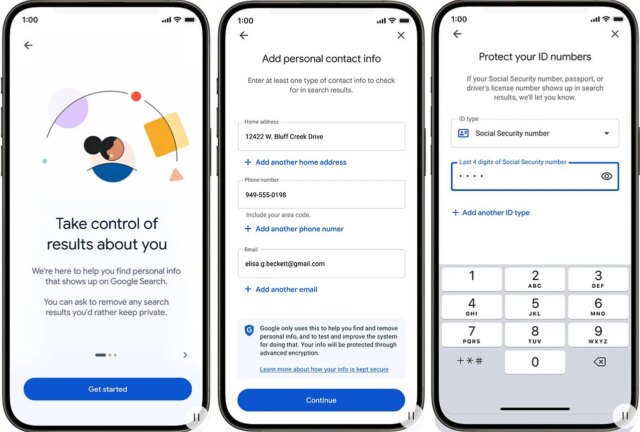 Sul Internet, vai al Risultati sul tuo hub. Nell’app Google, seleziona la foto del tuo account, quindi tocca “Risultati su di te”. Se non hai mai richiesto la rimozione delle informazioni personali prima, seleziona il pulsante Inizia. Ti verrà chiesto di aggiungere i tuoi dettagli di contatto, inclusi nome, indirizzo di casa, numero di telefono e indirizzo e-mail. Se l’hai già utilizzato in precedenza, seleziona l’icona a forma di ingranaggio in alto per modificare le informazioni che hai già aggiunto.