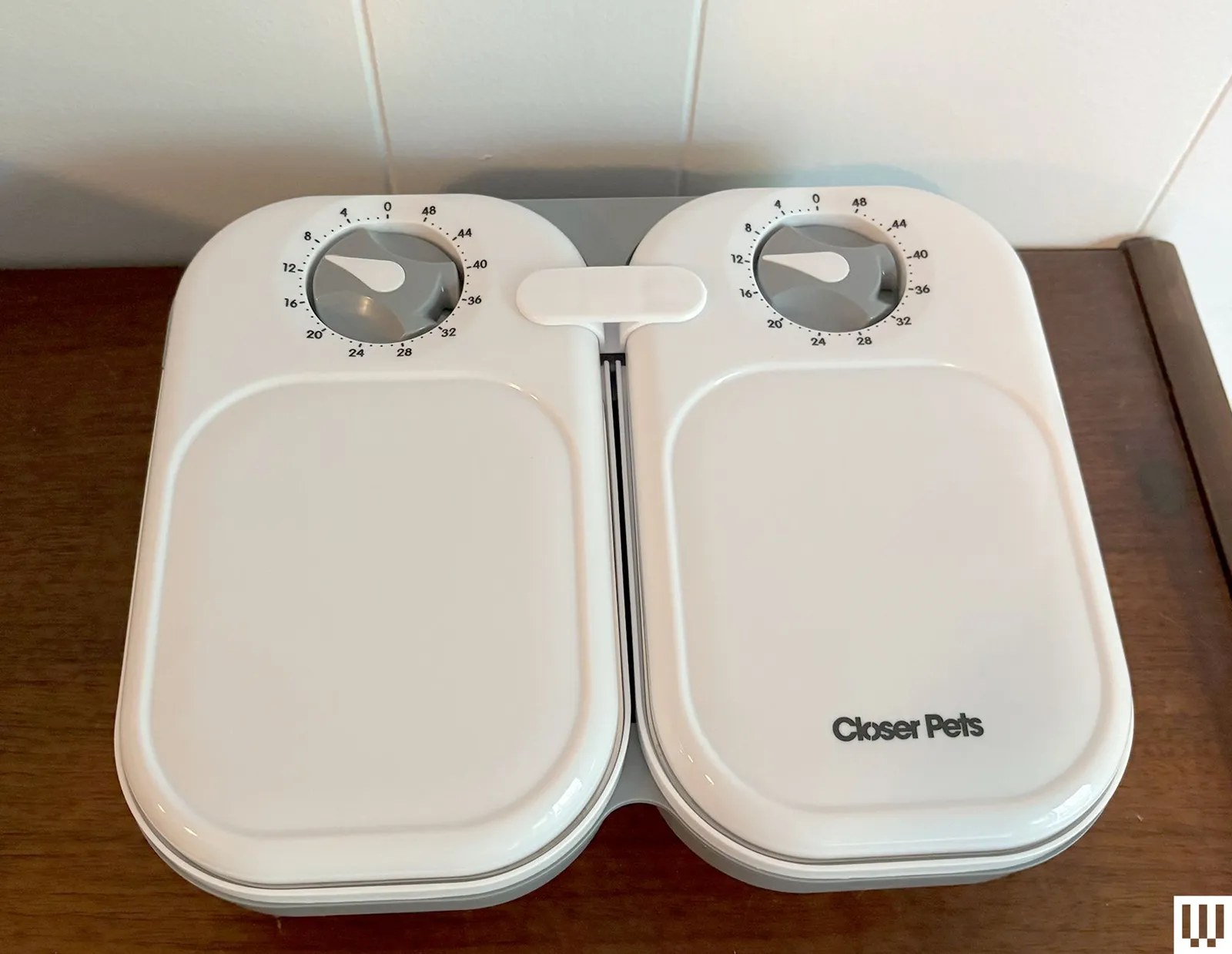 Alimentatore automatico per animali domestici a 2 pasti Closer Pets C200 per $ 50: Questo alimentatore automatico è semplicissimo, il che è sia il suo punto debole che il suo punto di forza. Si tratta essenzialmente di due contenitori di plastica poco profondi con inserti in acciaio inossidabile (entrambi lavabili in lavastoviglie) e coperchi antimanomissione che si bloccano e si aprono automaticamente utilizzando un timer a forma di uovo della vecchia scuola che funziona con una batteria AA anziché con l’elettricità. Sebbene il contenitore sia dotato di un impacco di ghiaccio per mantenere fresco il cibo umido, dopo una notte ha perso praticamente tutta la sua freschezza. C’è un attacco a clip per il collegamento del coperchio, un piccolo pezzo di plastica che collega i coperchi per garantire che si aprano contemporaneamente, il che è molto utile per i proprietari di due gatti come me. Vorrei che il timer fosse elettrico in modo da poterlo programmare sull’ora esatta in cui voglio che si apra, piuttosto che indovinare i tempi sui piccoli segni. Tuttavia, questa è una soluzione semplice per garantire che entrambi i miei gatti ricevano cibo umido senza che io debba svegliarmi alle prime luci dell’alba.