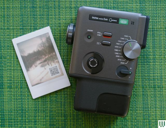 Il lato della fotocamera ha un pulsante di accensione e due interruttori, uno per spostarsi tra le modalità foto e video e l’altro per disattivare i fotogrammi e gli additional disponibili come sovrapposizioni (che variano in base all’effetto “period” che stai utilizzando). C’è anche un piccolo quadrante che funziona come interruttore di stampa e un interruttore per controllare lo zoom digitale.