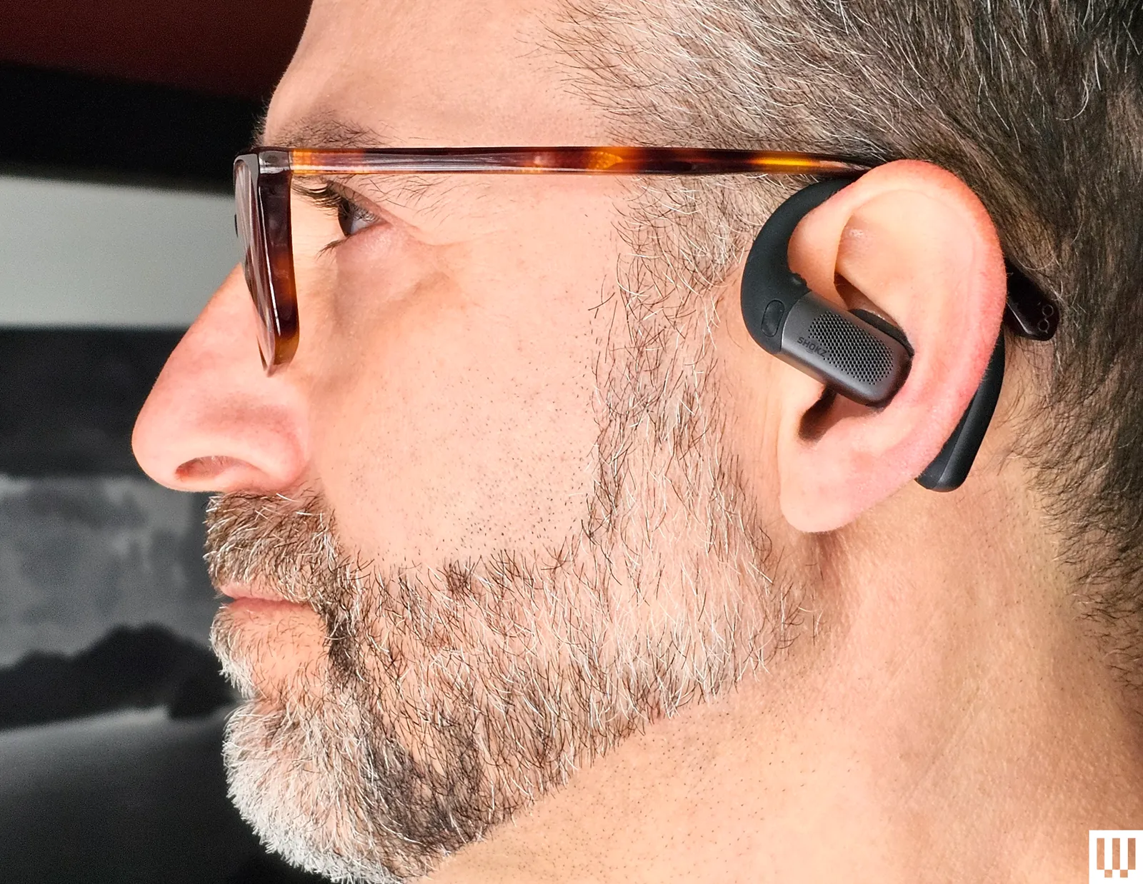 Il consolation è un vantaggio chiave della serie OpenFit di Shokz e OpenFit Professional, con ganci per le orecchie avvolti in morbido silicone, non fanno eccezione. A differenza dei precedenti modelli OpenFit, che posizionano gli altoparlanti appena fuori dalla conca dell’orecchio, i pod degli altoparlanti del Professional si proiettano direttamente nelle orecchie e, nel mio caso, entrano in contatto con la parte interna di quella cavità. Ciò aumenta notevolmente la stabilità, ma col tempo mi sono reso conto di quel punto di contatto.