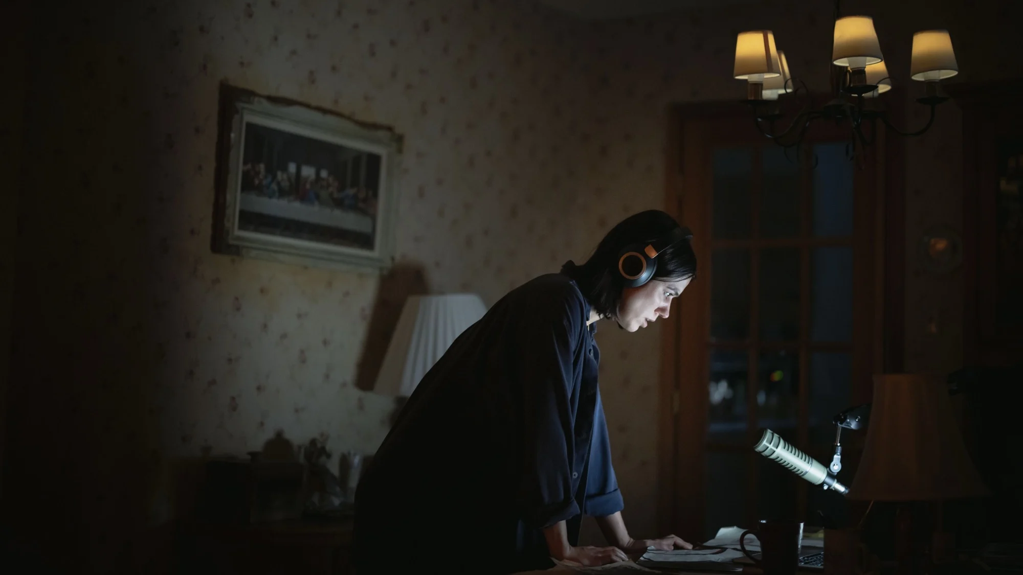 L’unico amico che Evy sembra avere è il suo companion di podcast Justin (Adam DiMarco, che non viene mai mostrato sullo schermo), che vive nel Regno Unito, il che significa che l’orario migliore per registrare è alle 3 del mattino per Evy. Nel silenzio della notte, si china sul tavolo della sala da pranzo che ha trasformato in una postazione per podcast, completa di cuffie con cancellazione del rumore, un microfono prominente, i suoi appunti e un laptop computer luminoso. Visivamente, l’elettronica moderna e fredda di Evy si scontra con la carta da parati floreale di sua madre e il necessario Ultima Cena stampa appesa dietro di lei. Ma gli scontri più forti arriveranno anche nell’audio Sottotono racconta la sua storia sfuggente.
