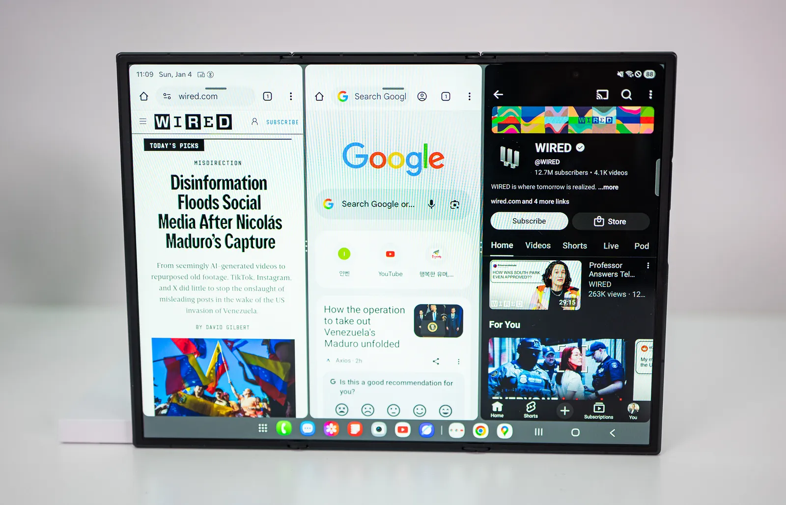 Ci sono due cerniere in titanio e aprono tre pannelli. Puoi posizionare un’app a dimensione intera su ciascuno dei tre riquadri, utilizzare una versione più grande dello schermo diviso o espandere un’app sull’ampio show. È stato facile configurare queste configurazioni e riesco a vedermi totalmente avvantaggiato dall’avere tre app aperte contemporaneamente. È ancora un po’ scomodo da tenere in mano, ma non è insolito per un pill da 10 pollici. Il TriFold è molto sottile quando è aperto, il che aiuta.